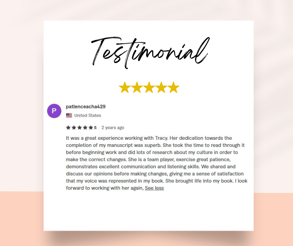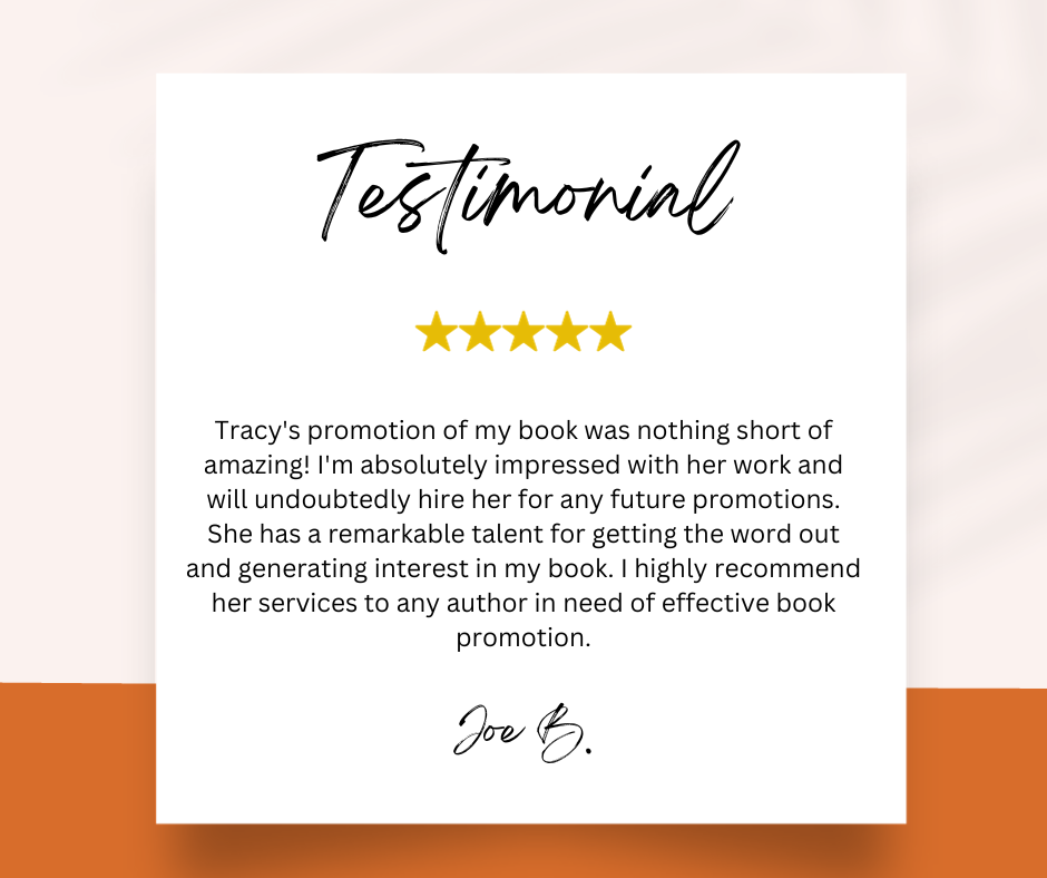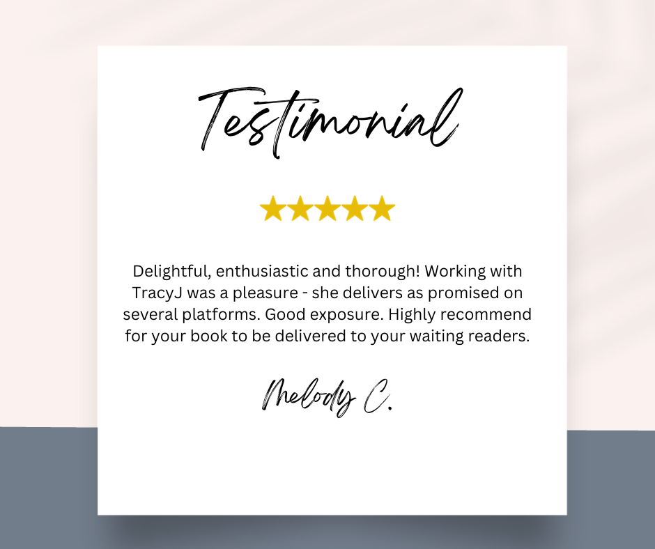 ⭐️ ⭐️ ⭐️ ⭐️ ⭐️ Tracy exceeded all my expectations in promoting my first book. Her professionalism shone through every aspect of the project. The promotional materials were meticulously crafted, demonstrating both creativity and market awareness that perfectly captured the essence of my book. What impressed me most was Tracy's exceptional delivery time. Working with Tracy was truly a 5-star experience, and I wouldn't hesitate to recommend her services to any author looking for professional book promotion.