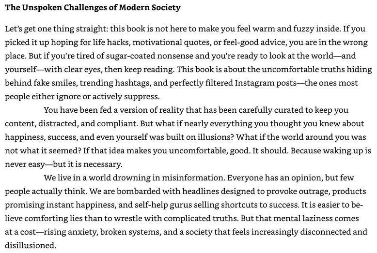 Chapters will be germane to you personally, discuss those around you, and expand outward to cover global truths.
